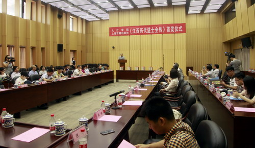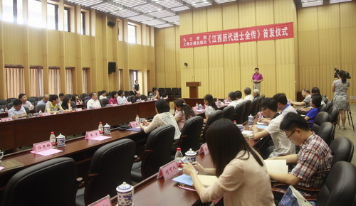 在首发仪式上,九江学院庐山文化研究中心常务副主任李宁宁教授介绍了《江西历代进士全传》编纂缘由及经过。自2012年3月,成立《江西历代进士全传》编纂工作委员会以来,九江学院集中全校的研究力量,启动《江西历代进士全传》的编纂工作。四年来,直接参与编撰的校内教师和研究人员多达52名,校外专家2人。参编专家深入国家图书馆、上海图书馆等国内大型图书馆,查找方志、家谱、碑刻等各种文献资料,复印了近30000页的进士传记材料。编纂过程中,专家们经常就某个进士归属某县或某个进士的双重籍贯问题进行讨论,或者为材料的多寡均衡问题而费尽心思,或者为寻找某篇文献的最早出处而上下求索。2015年完成初稿后,又用了一年时间进行加工打磨。