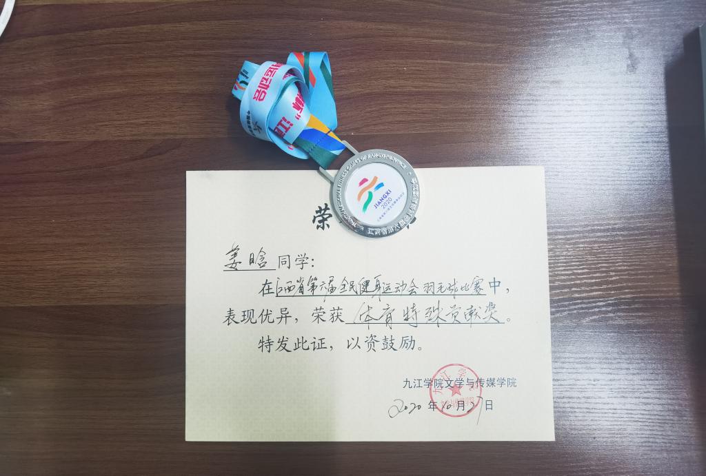 近日,“中国体育彩票杯”江西省第六届全民健身运动会羽毛球比赛在鹰潭市体育馆开赛。据了解,本次比赛为期三天,来自全省11个设区市、县(市、区)的代表队共220名运动员参赛,我校文传学院语文教育专业B1921班姜晗同学参加了女子单打比赛,经过奋力角逐进入四强,获得了二等奖的好成绩。