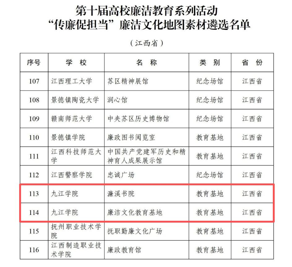 2月26日,教育部发布《关于第十届高校廉洁教育系列活动结果的公示》,我校“濂溪书院”“廉洁文化教育基地”两项作品入选“传廉促担当”廉洁文化地图素材遴选名单